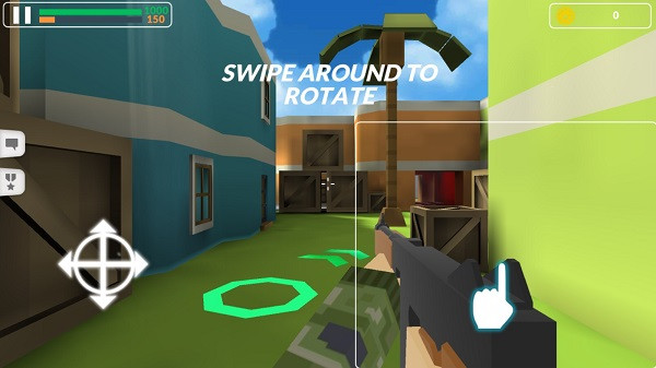 1、进入方块枪战游戏后会有详细的新手教学,如图,通过滑动右侧的屏幕来转动视角。