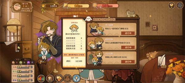 通过与镇上人们对话、做出选择,以提高女儿对父亲的评价不同的父亲目标将影响评分标准,请多注意。如果完成得好,将会在六月份的小鸟节上获得奖励哦。