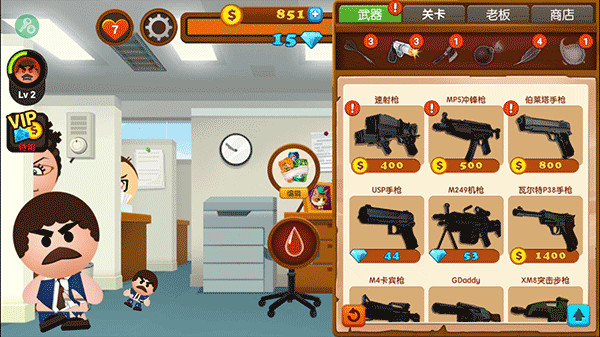 1、在暴打老板还可以自己制作武器,自动射击的步枪,让你能尽情的释放解压。