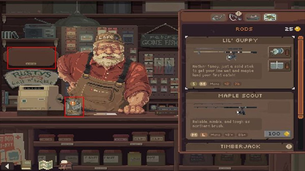 当你要换种新物种时,可以升级到稍微大一点的物种——小口黑鲈。小口黑鲈有S、M和L三种尺寸。不过,要开始钓它,你需要一个新的鱼饵——曲柄饵。只需15金币,卖完前三条鱼后,去钓具店取回。