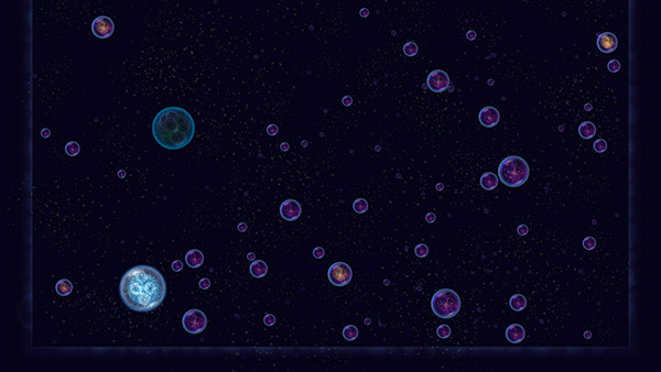 5、游戏中,唯一的变量是玩家操纵星球喷出的气泡,气泡的作用一是移动星球,二是可以推开附近的星球,利用气泡的功能,玩家在接近其他星球的时候,可以利用惯性和推力推开接近自己的红色星球。