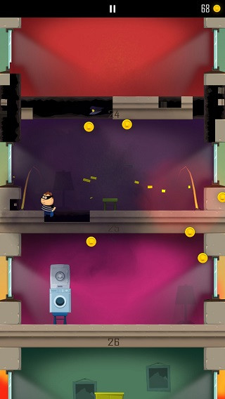 通过滑屏来进行对游戏的操控,向上则是跳跃,向下则是吨位砸楼层,操作方法非常的简便,人物会自动左右移动,需要依靠玩家的判断方向砸楼层。在游戏初始会有很详细的新手教程,让你快速上手,没有很大难度,配合紧张刺激的警鸣音效,砸楼层时坍塌楼板的声音,基本没有误操作就可以最大程度体验惊险破坏的乐趣。