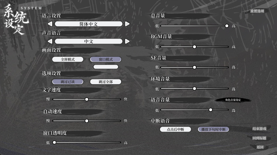 -游戏提供多种自定义设置,包括语言、画面、音量和文字速度等选项。