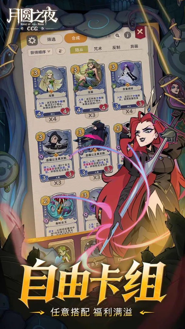 月圆之夜ccg是以1v1对战为核心的策略卡牌游戏,在延续经典美术风格的基础上融入了全新的竞技玩法。月圆之夜ccg游戏玩家可以从多位风格各异的英雄中进行选择,每位角色都拥有独特的技能体系与战斗定位。对局过程中需要不断收集与搭配卡牌,通过构筑专属卡组来应对不同战术变化。游戏内卡牌类型丰富,包括随从、咒术与反制等多种机制,使战斗过程更具策略深度与变化空间。月圆之夜ccg官方版独特的觉醒系统为对局增加了翻盘可能,让战局充满不确定性与紧张感。