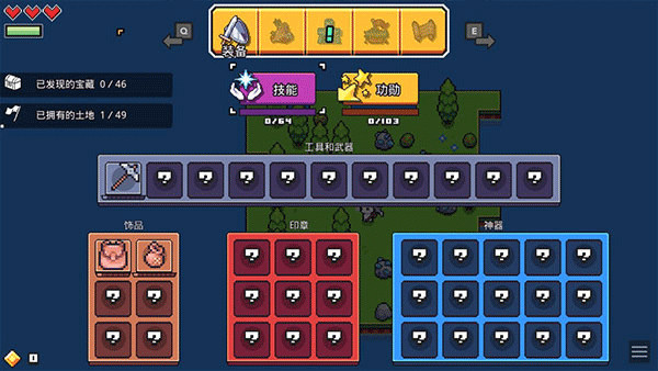 点击菜单栏中的“装备”按钮,可打开装备界面,此处将展示已经解锁的工具、武器、饰品、印章及神器。