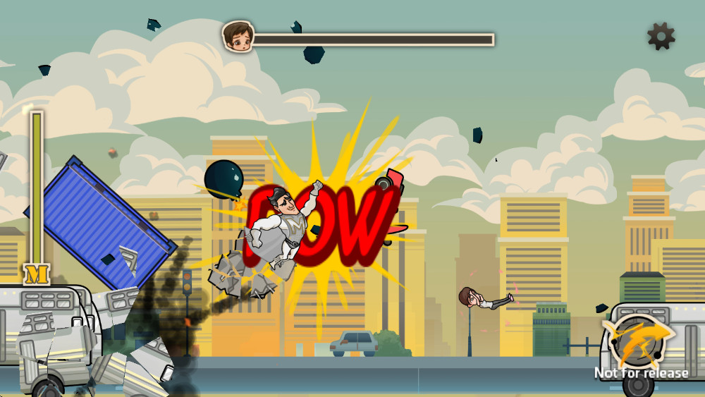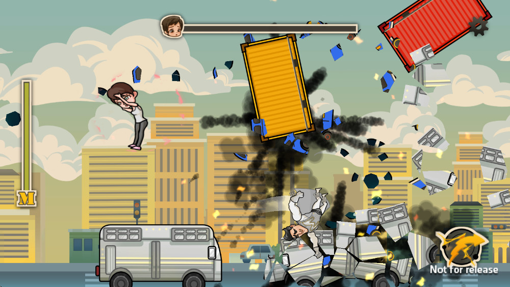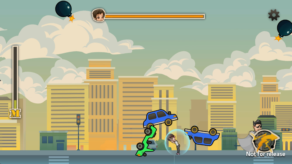 成都超人前半段的核心就是保护场中的女主,玩家要不断处理从周围飞来的车辆和杂物,把能拦下的攻击尽快清掉。画面里的压力会一波接一波往上堆,玩的时候需要一直盯着落点和来向,不能只顾一个方向。