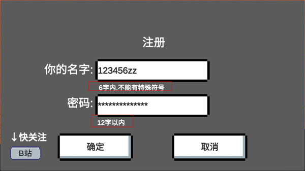 3、输入一个名字和密码,注意名字是6个字符之内不能有特殊符号,密码是12个字以内;