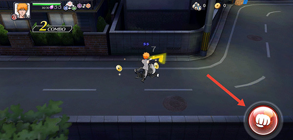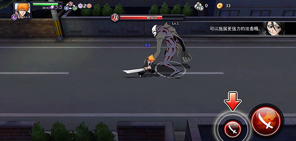 1、在死神勇敢的灵魂游戏中玩家在左边屏幕滑动来操作角色的移动,右边为攻击按键
