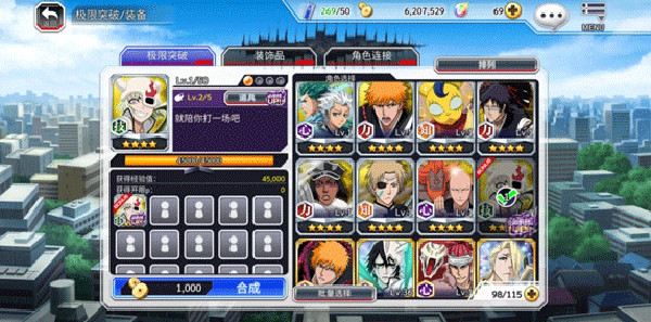 玩家可以通过消耗同稀有度同名人物或消耗必杀技的秘诀来提升必杀技等级。必杀技的秘诀共两种:特定属性的必杀技的秘诀(知、力、技、速、心)只能强化相同属性的人物以及必杀技的秘诀(虹)可用于强化任何属性的人物必杀技。同稀有度同名人物则意味着被消耗角色的属性、稀有度、名字都需与基底角色相同,等级无要求,比如:消耗1级5星黑崎一护可以使100级5星黑崎一护的必杀技等级从1升级为2。