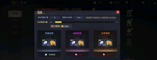 1、公会签到,每日一次,可以获得贡献币和公会资金,普通玩家每日用银币签到就行,大佬或者准备冲击排行榜的玩家,可以用粉钻拉满