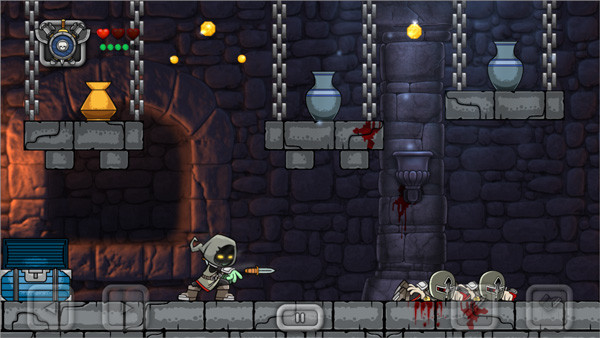 3、 游戏的操作类似于大多数水平冒险游戏。左下角的虚拟按键控制角色的左右移动,右下角的两个虚拟按键分别是跳跃和攻击。