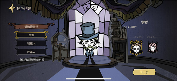 游戏开始后先要创建角色,除了可以选择性别之外,还可以选择身世。目前有「学者」、「驱魔人」和「吹笛人」可供选择,身世只会影响外观,所以挑自己看得顺眼的就行了。