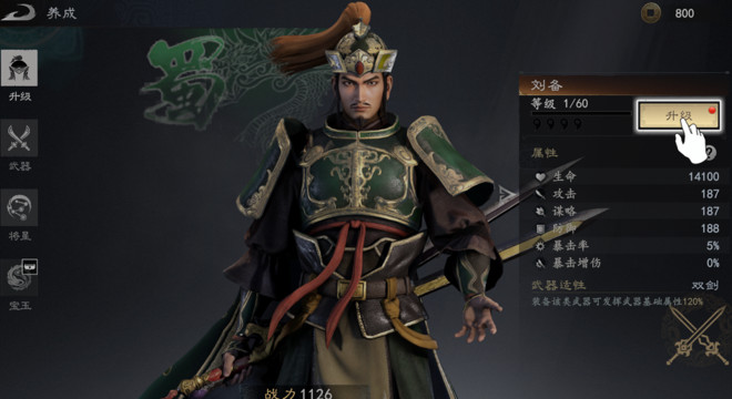 9、玩家还可以对自己的武将进行养成,进入武将面板,玩家可以对武将进行升级,自由搭配武将的武器、技能、配饰。让武将战力增加