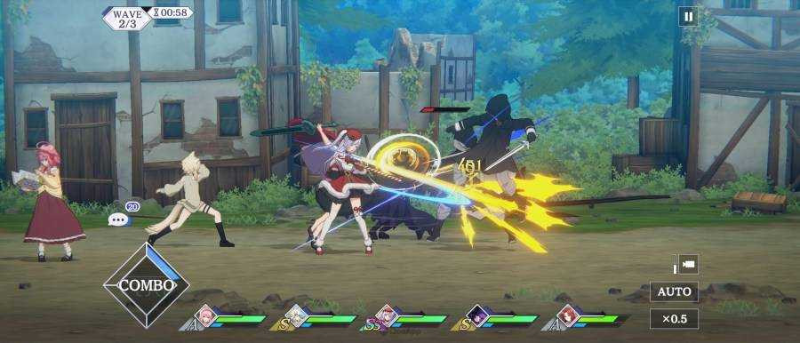 战斗系统相当简单,开始后会以半自动的形式展开(新手教学结束后可直接全自动+两倍速)ˋ,随着与敌人一来一往的自动攻击,可使用画面左下随机选出3人、根据先后顺序附加越来越多Buff的 Strike Combo 技,或是各角色的必杀技。 另外,通关后可以开启扫荡机制,加快等级提升的速度。