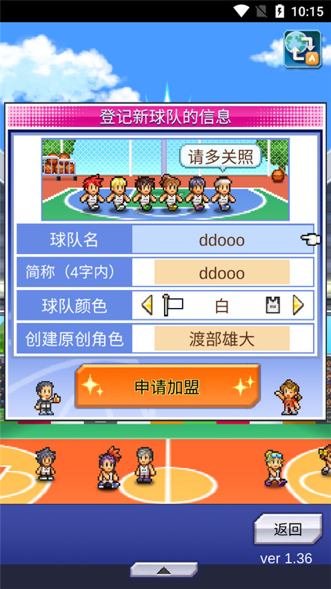 4、可以对球队队名、队服及原创角色名进行自定义设置,在这里登记完新球队的信息就点击“申请加盟”按钮。