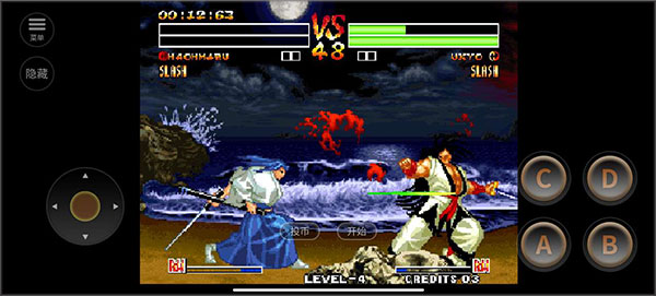 1、下载安装好侍魂4手机版,进入游戏进行投币,点击开始。