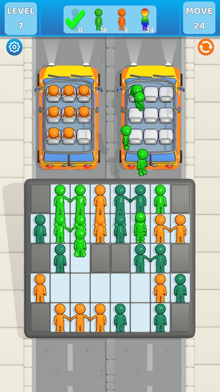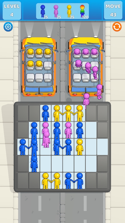 3.合理安排角色位置是游戏的核心。根据每种颜色只能坐同一辆车进行座位安排,测试它的座位安排能力。