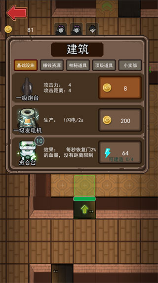 3、玩家可以放置炮塔进行攻击,全新冒险挑可以建造更多的攻击性建筑