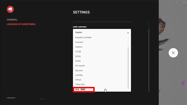 3、在SETTINGS页面点击“GAMT LANGUAGE”,鼠标下滑找到“繁体中文”选项即可进行设置。
