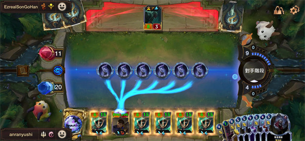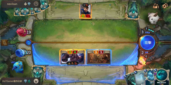 符文大地传说国际服的对战以回合为单位,双方轮流攻守,攻击方每打出一张牌,防守方可回应一张,例如,你打出一张英雄卡,并不能立马发动攻击,需要等待对方确认是否打出,同样,魔法卡也是一个道理。