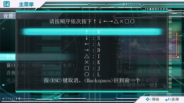 3、使用键盘上下键进入设置,玩家可调整游戏分辨率、键位、音效等;