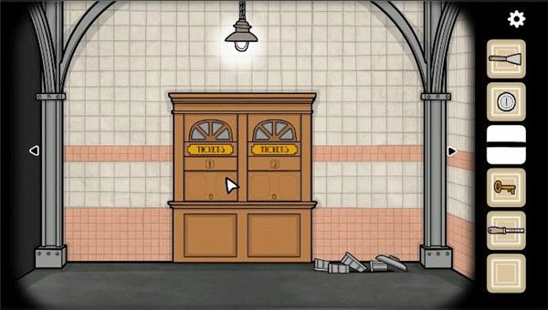 10、然后我们去到垃圾桶旁边的售票处,用钥匙开门,用水管敲击门框,叫醒售票员然后和她互动,提示我们需要一枚硬币。