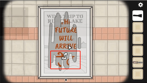 5、在婴儿车旁边的场景里有一张海报,用铲子把海报刮烂,就看到“THE FUTURE WILL ARRIVE”,也就是未来即将到来的意思。然后海报底部会出现一个神秘符号。