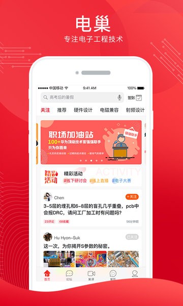 电巢APP是一款为分享、学习电子工程技术设计的软件,软件为用户打造了一个垂直电子技术数字生态圈,提供了各种各样的电子工程相关行情分析以及最新资讯,线上可随时进入学习,包含了各种硬件数码信息,通过数据挖掘建立推荐引擎,将资讯、技术文章、产品、活动、视频课程、短视频等内容推荐给用户。