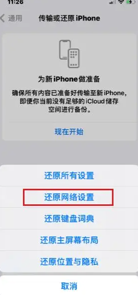 操作步骤:依次进入【设置】-【通用】-【传输或还原iPhone】-【还原】,选择【还原网络设置】。