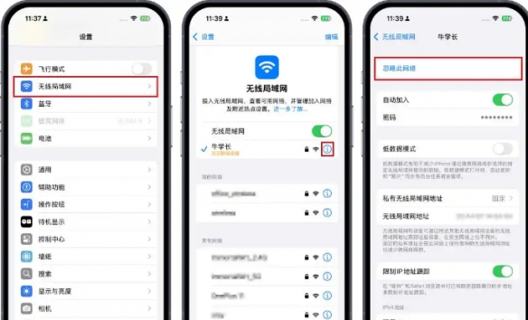 操作步骤:进入【设置】-【无线局域网】,点击问题WiFi右侧的“i”图标,选择【忽略此网络】,确认后重新输入密码连接。