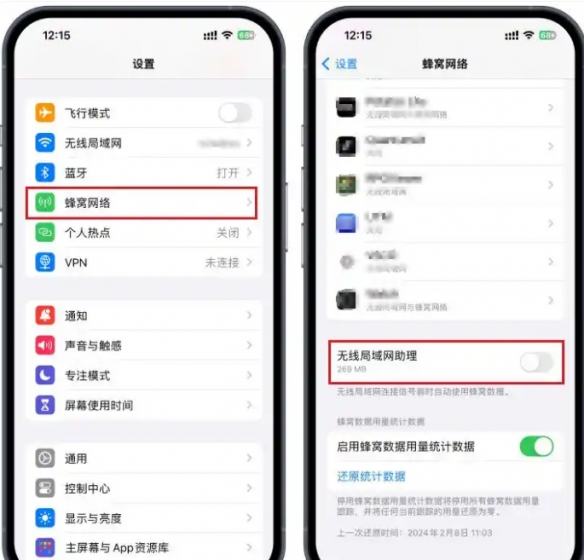 操作步骤:进入【设置】-【蜂窝网络】,向下滚动至底部关闭【无线局域网助理】。