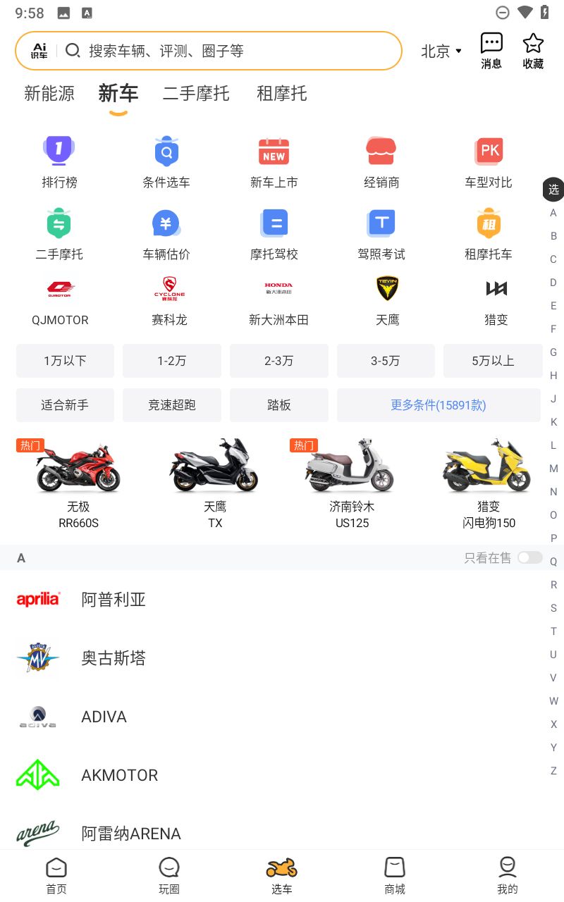 3、点击选车,选择自己想要购买的摩托车的品牌。