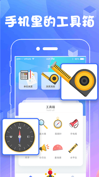 集合日常生活所需的多功能测量工具箱软件,小巧实用的测量工具,让你的手机瞬间变成,一把精准的测量尺子,集成了距离测量,高度测量,水平测量,角度测量,挂画校准工具。