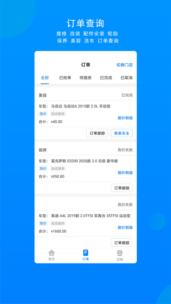 主要提供线下维修、改装、配件安装、保养、轮胎、美容门店通过平台线上承接汽车服务订单引入客流到店内,提高店铺客源流量。
