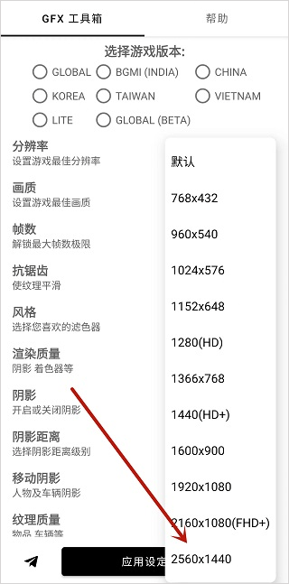 3、接下来我们还能对游戏的分辨率进行设置,选择最底端的“2560X1440”选项,这就是目前画质最好的2k分辨率了!