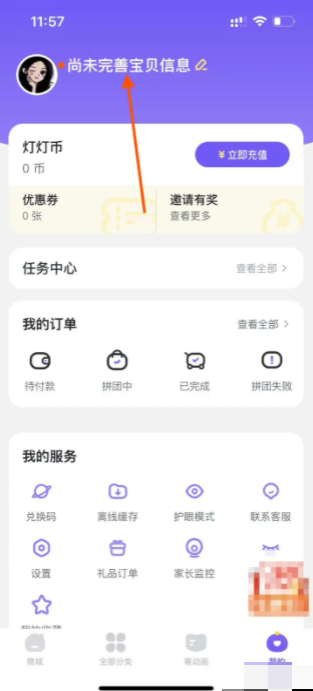 2、进入小灯塔APP【我的】页面,点击【完善宝贝信息】。