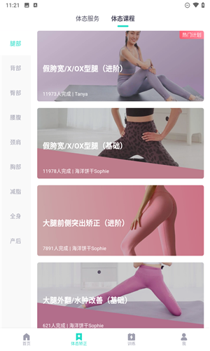 体态训练:专注于体态训练,提供了针对腿型塑身、马甲线、一字肩、天鹅臂等多种塑身教学视频,并对用户的体态进行评估,帮助用户认识到自身需要改善的地方。