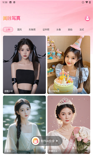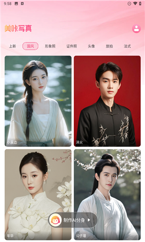 你是否在为自己适合什么类型的风格而苦恼呢,如果出去花大价钱拍出来的写真不对自己的口味也是一件非常难受的事,美咔写真就很好的帮助用户解决了这个烦恼。软件内味大家提供了上百种风格的照片写真模板素材,用户上传自己的照片后就可以试着使用AI替换,看看自己适合什么风格,然后再去线下约拍。
