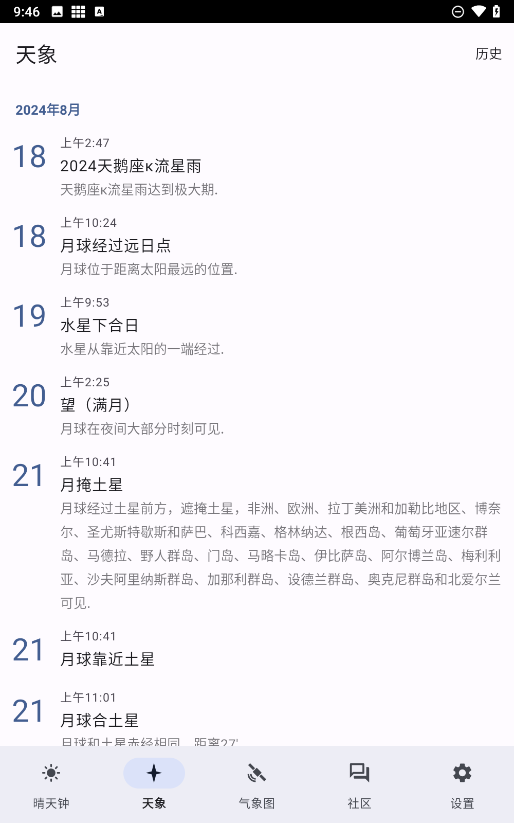 晴天钟是一款天文爱好者绝对不能够错过的软件,软件按照经纬度显示天气数据,日升日落,月亮情况等数据方便用户进行天文观测。它的系统来源主要靠美国国家大气海洋局,气候环境预测局的数据检测模式。所有数据均为精准计算,让我们能够随时随地任意的掌握当前天气情况,什么时候有流星雨,获取恒星,行星的数据,还可以在论坛上与其他天文爱好者一起互动交流。