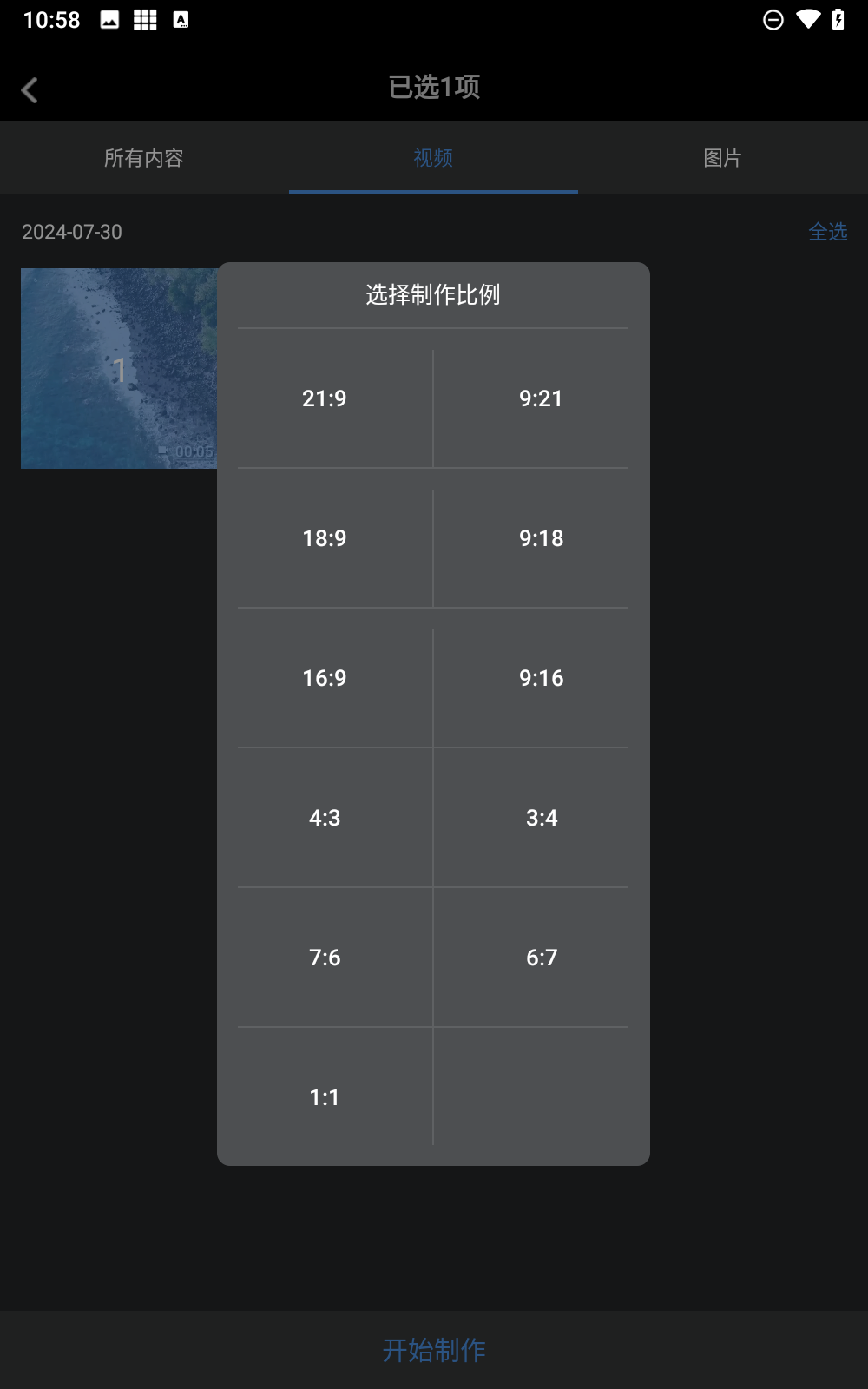 2、选择素材,您可以选择图片和视频,选择完毕后,点击下方【开始制作】进入到下一步: