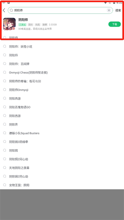 2、在搜索栏中输入需要下载的游戏,以阴阳师为例输入后会弹出有关阴阳师在本站所有相关的信息;