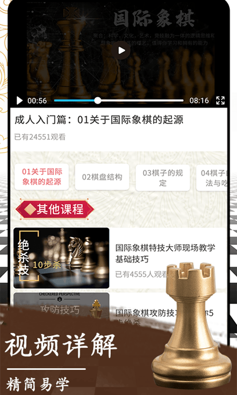 国际象棋是一款线上国际象棋软件,软件中给予用户广阔的平台可以学习多种象棋的知识,同样的软件还有不同的视频教学详细的教学,当然软件中还有可以和各地的用户进行实时对局帮助自己更好的提升,国际象棋教学与对弈,彩旗手游网为您提供国际象棋最新版官方下载,国际象棋正式版官方免费下载,国际象棋V1.1.2安卓版免费下载。