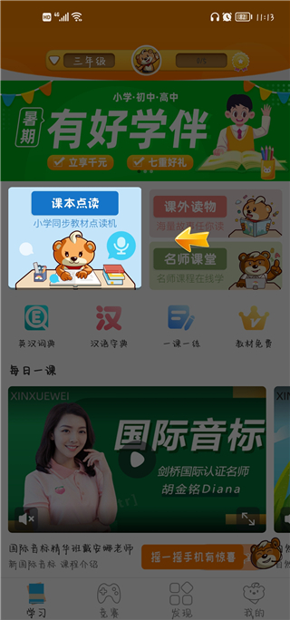 3、进入软件首页,为用户提供了课本点读,课外读物,名师课堂等多个板块的学习内容。