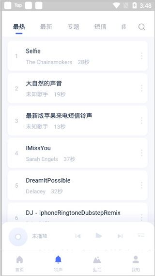3、在“铃声”中也是分为:最热、最新、专题、短信等。