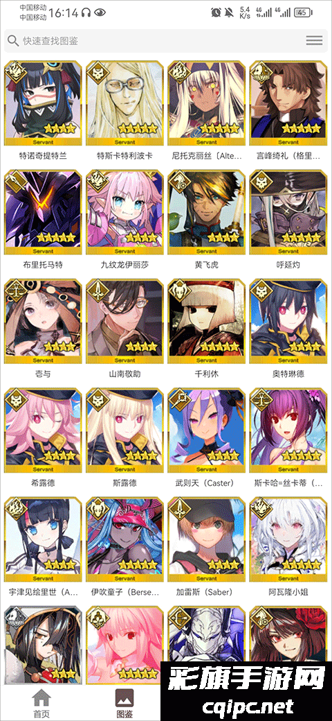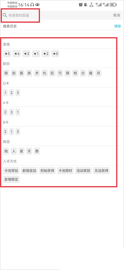 2、点击上方的快速查找图鉴后,可以在搜索框中输入你要查找的角色名称,也可以根据下方星级、职阶、Q卡、A卡等分类查找