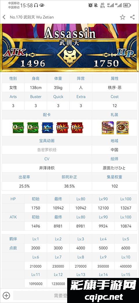 3、查找到指定角色图鉴后,点击进入可以查看到该角色的属性、配卡、礼装、宝具等各种详细信息