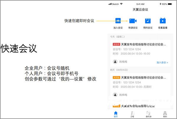 4、快速会议中企业用户:会议号随机,个人用户:会议号即手机号,创会参数可通过“我的—设置”修改