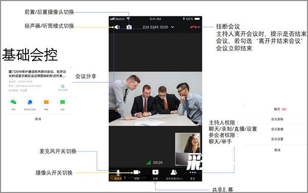4、会议控制管理,管理员可以在会议过程中对会议进行管理和控制,包括静音、静音、屏幕构图风格调整、轮询设置、会议密码设置、会议时长设置等功能;
