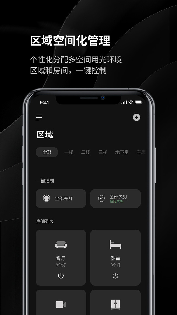 2、个性化分配多个空间的用光管理和区域房间都能一键进行控制