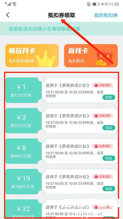 10、在【折扣券】界面,可领取该游戏的代金券,进行消费充值的时候可以抵扣现金,